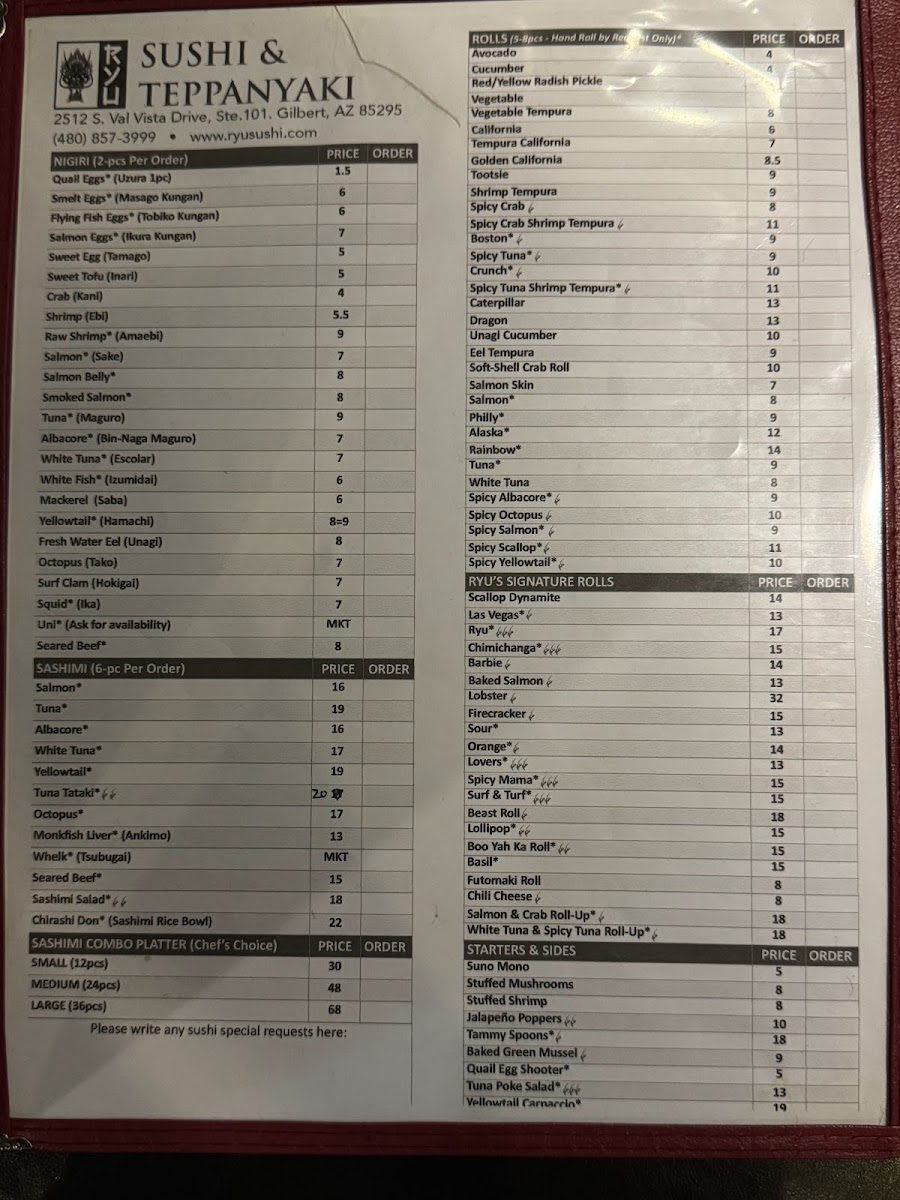 Welcome to Ryu Sushi & Teppanyaki, a captivating Japanese restaurant nestled in Gilbert, AZ. This culinary gem combines the timeless appeal of traditional sushi with the excitement of teppanyaki. Here, each dish is a testament to skill and flavor. Guests can relish an array of options, from expertly crafted spicy jalapeño poppers to the highlight of the menu: the succulent USDA choice sirloin strip teppanyaki, accompanied by fresh veggies and fluffy white rice.